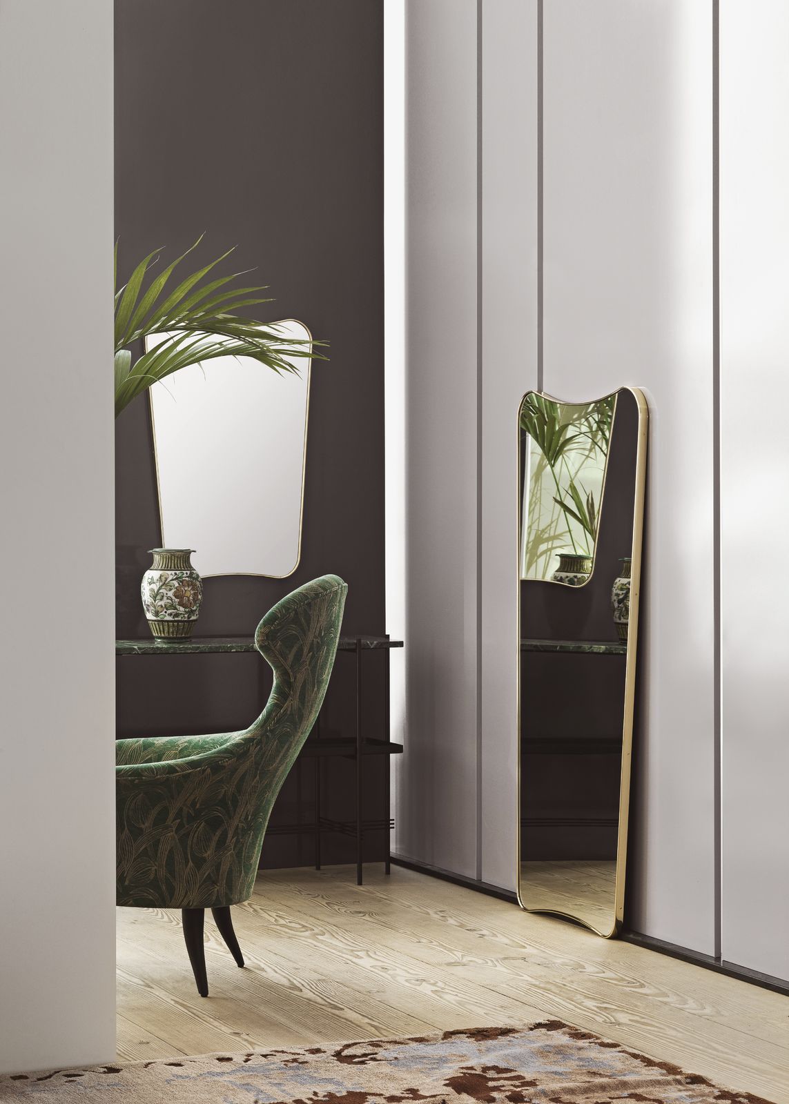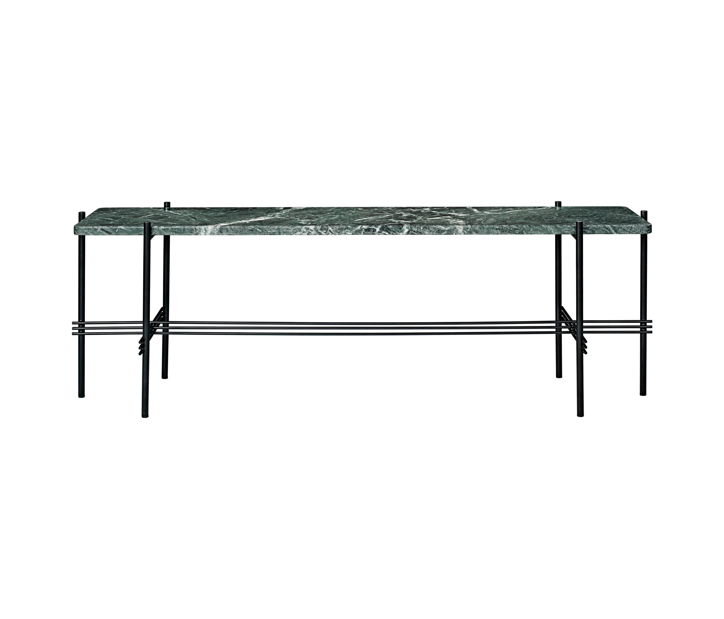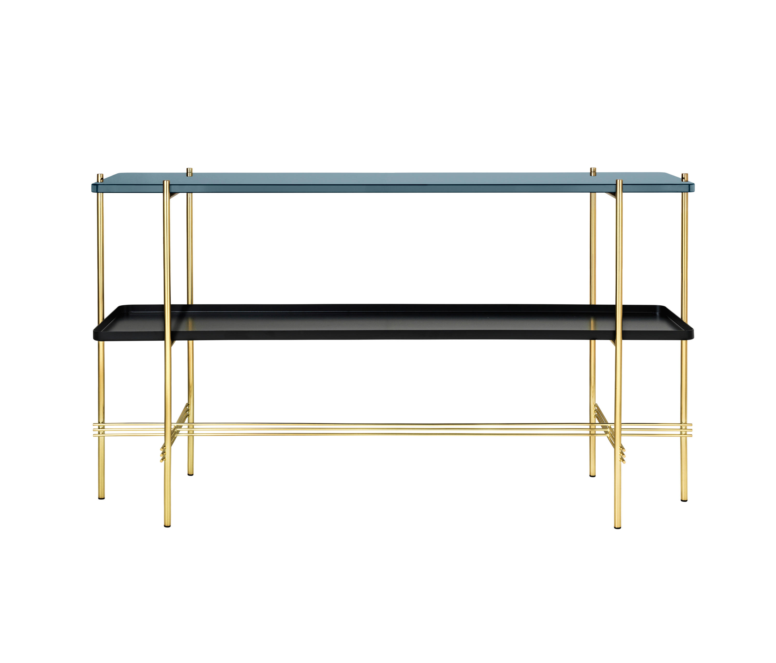 TS装饰架有两个版本——TS装饰架1和TS装饰架2。TS装饰架1有一个大理石托盘和TS装饰架2有两个大理石托盘,或一个大理石托盘和一个金属托盘。在两者上,一个黑漆框架是对比大理石顶部。