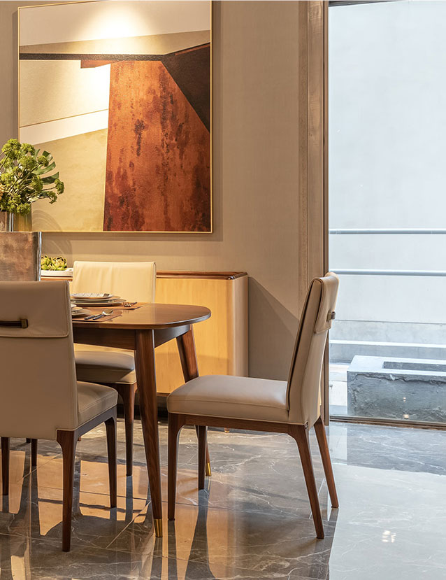 餐桌造型现代优雅,提供了一种轻奢简约的生活方式。在细节处,餐桌桌面采用黑胡桃饰面工艺,实木感强,且不变形。