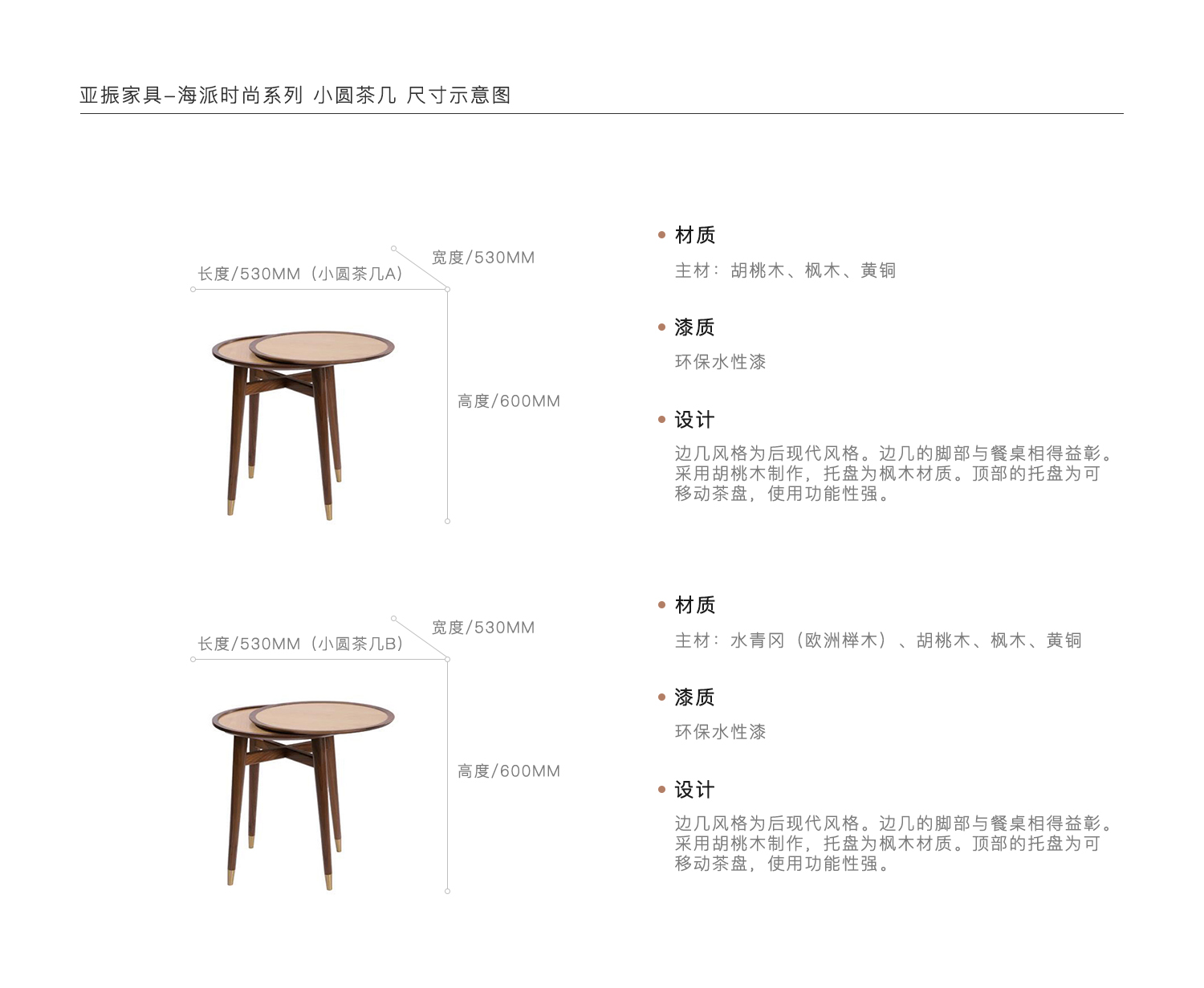 边几风格为后现代风格。边几的脚部与餐桌相得益彰。采用胡桃木制作,托盘为枫木材质。顶部的托盘为可移动茶盘,使用功能性强。