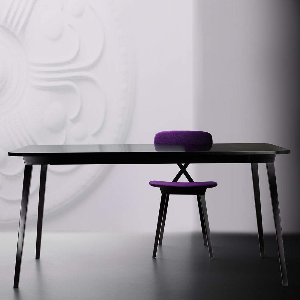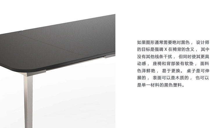 如果图形通常需要绝对黑色,设计师的目标是强调X在椅背的含义,其中没有其他线条干扰,但同时使其更具动感,座椅和背部装有软垫,面料色泽鲜艳,易于更换。 桌子是可伸展的,表面可以是木质的,也可以是单一材料的黑色塑料。