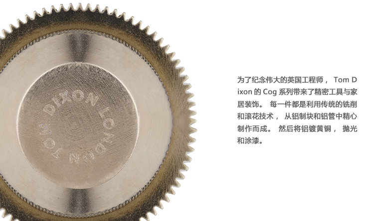 为了纪念伟大的英国工程师,Tom Dixon的Cog系列带来了精密工具与家居装饰。每一件都是利用传统的铣削和滚花技术,从铝制块和铝管中精心制作而成。然后将铝镀黄铜,抛光和涂漆。 这个过程给人的感觉是这些作品在某种程度上意味着更大的东西,但现在却被用于更简单的目的。