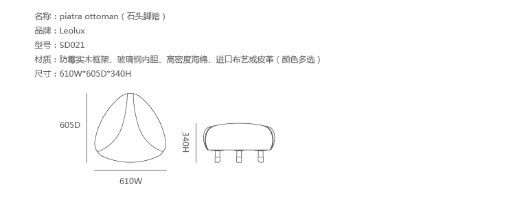 Piatra Ottoman(石头脚踏),设计师Norbert Beck的作品。这款石头造型的脚踏,看着是不是很想驻足休憩?其有着特色的缝合线,Piatra Ottoman(石头脚踏)通过选择曲面、 边角料或不同颜色,无论从任何角度欣赏都是不一样的,就好比这世界上没有任何两块相同的石头,Piatra Ottoman(石头脚踏)是独一无二,与众不同的。制作采用高密度发泡海绵内胆、进口布艺或皮革(颜色多选)。