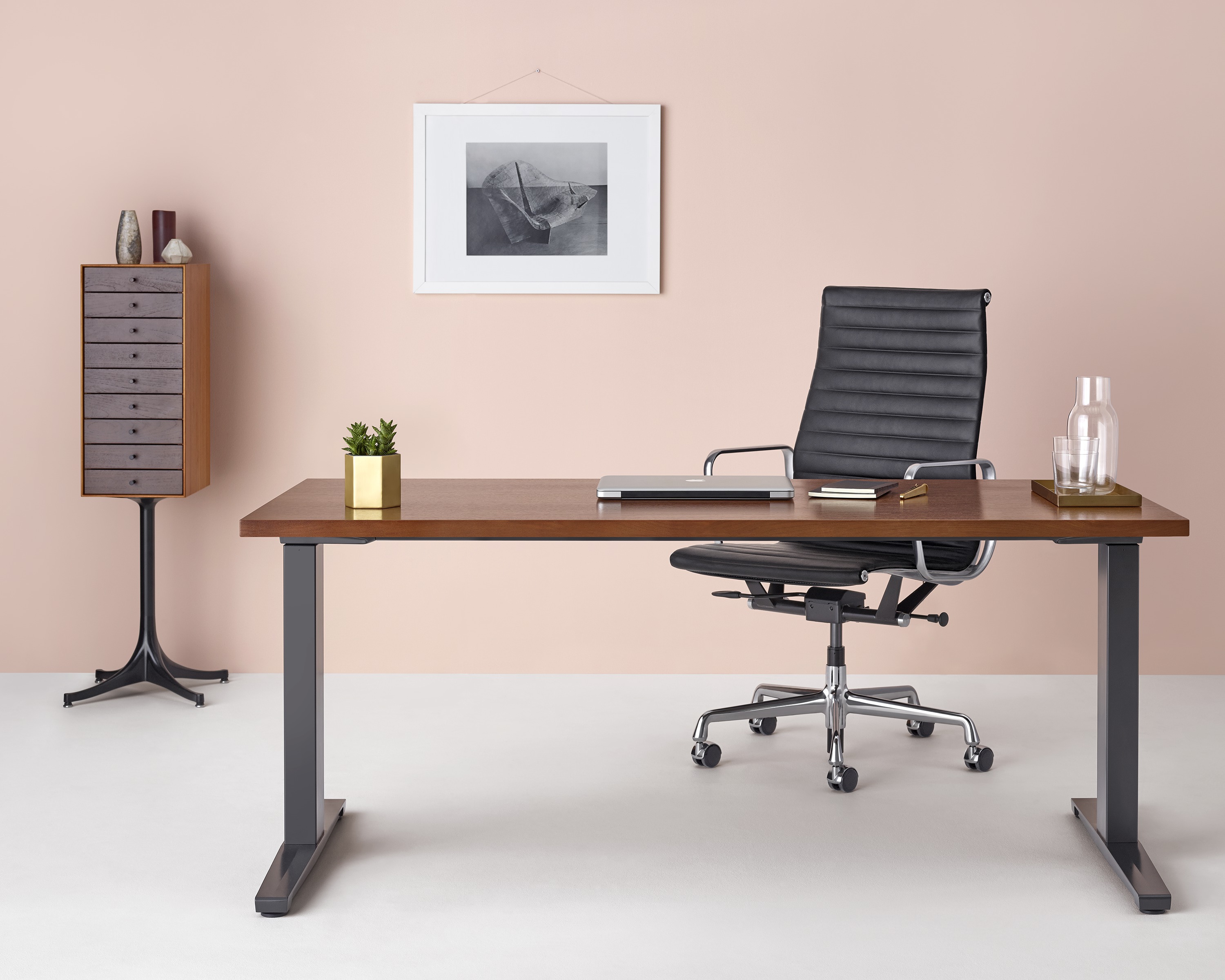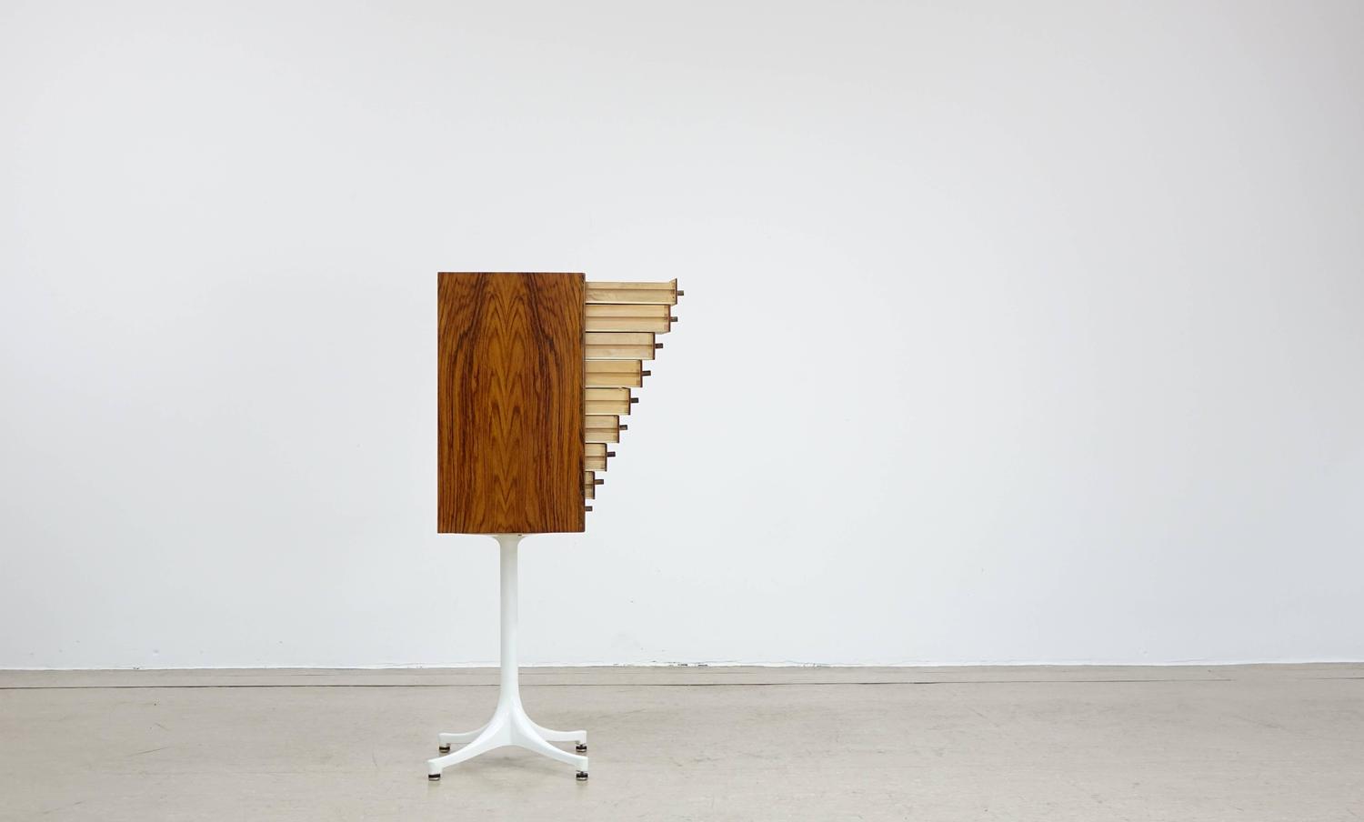 乔治·尼尔森(George Nelson)是美国极具影响力的建筑师、家具设计师和产品设计师,日本对George Nelson有着深远的影响。在他于1951年第一次到东京旅行,以及之后在那里的十几年,George Nelson迷上了日本的所有东西。这种影响最明显的的他于1952年设计的迷你箱。迷你箱的神奇处是可用来存放各种物品,是一个很多小抽屉小储物柜,方便您分类摆放各种生活物品。尼尔森设计的迷你箱最让人惊奇的是它几乎可以摆放在任何房间,无论是卧室,办公室,客厅等等任何您需要的地方,美观且不失和谐。每个抽屉都是木工们细心的安装设计,以保证高品质。抽屉采用胡桃或樱桃木皮贴面,基材为环保高密度板环保油漆喷涂、铸铝烤漆可调节脚架(4星级铝底座)、或玻璃钢一体成型脚架,抽屉贴心的配置有金属旋钮,方便打开与关上。