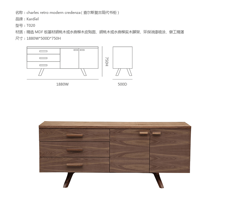 charles retro modern credenza (查尔斯复古现代书柜)是Kardiel公司制作的经典实木家具。书柜结合外型、材质和功能性等不同诉求,设计简约质朴。charles retro modern credenza (查尔斯复古现代书柜)提供无论外型或空间都极具特色的储藏功能,创造出您专属的特色储藏系统,亦可作为空间感、通透感十足的隔间柜使用。精选MDF板基材胡桃木或水曲柳木皮贴面、胡桃木或水曲柳实木脚架、环保油漆喷涂、做工精湛。