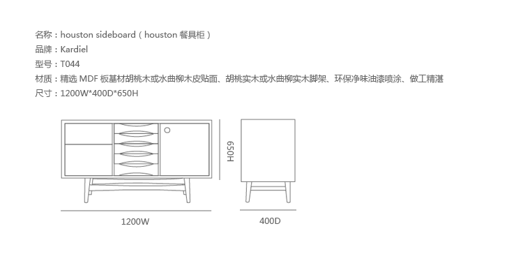 houston sideboard(houston餐具柜)是Kardiel公司制作的经典实木家具,具有世纪中期的现代风格。它如恒星般色彩绚烂,拥有多个隔间以及数吨的存储空间。在现代主义的存储家具上, Finn Juhl和 Arne Vodder 最先尝试胶木和天然木的组合运用。这是大胆的创新,他们结合传统的新鲜的新兴技术与现代主义的概念。制作采用精选MDF板基材胡桃木或水曲柳木皮贴面、胡桃实木或水曲柳实木脚架、环保油漆喷涂、做工精湛,是您理想的选择。