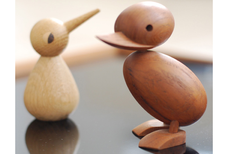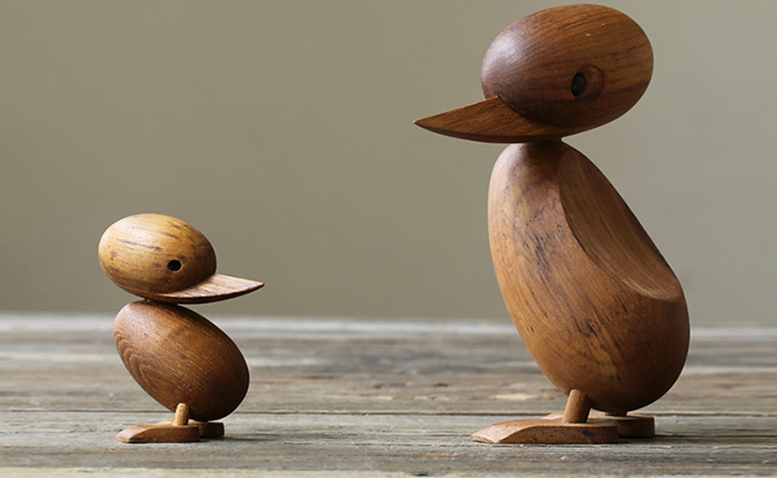 Wooden Duck And Duckling(木鸭与小鸭子)的制作灵感来源于真实的故事,故事回到了1959年丹麦哥本哈根的春天场景。正当人们与自然万物自由的伸展苏醒时,某天,在Frederiksberg街头出现了春天出游的鸭妈妈正带领着一群呱呱叫的可爱小鸭过马路的画面,随后,出现了一位警察为牠们指挥交通并顺利的过了马路,隔天报纸就刊登出这幅景像并引起广大的回响。这看似不可思议的美好事件却反应出丹麦人珍惜呵护自然的天性,在与之共处的过程中总是细微观察并不断的上演着触动人心的情景。在那重视手工艺的黄金50年代,全球正掀起了一股「斯堪地那维亚现代主义设计」风潮,丹麦设计大师Hans Bølling为推手之一,他因为鸭子事件的报导而深受感动,因此设计了手工木鸭,作品中不但展现出简洁有机的线条并揉合了精湛的手工艺技法,且将主题延伸至人文社会环境的关怀,以独特的事件观点触动人心,而这正是「斯堪地那维亚现代主义设计」所要反应出的设计观点。这款1959年份出品的手工木鸭,虽经历了半个世纪之久后再度问市,却依然深得人心。当二十一世纪的人们开始了解到美好的生活似乎越来越像个神话,而地球上的物种灭绝的速度比科技发明来得快且无解时,出现了回归自然与环保的声浪,人们因此更懂得珍惜自然以及传统手工艺的经典设计,一种无法被工业化所取代的价值感与慰藉。
