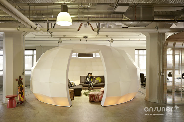 Runway社区,新兴创业者的孵化基地。设计的挑战在于如何将其打造成一个热情且具特色的办公空间,使其在众多同行中脱颖而出。设计团队以前卫的设计概念将这座位于 Twitter大楼占地30,000平方英尺的孵化基地打造成一个时尚的社区,而非仅用以工作的办公场所。刚起步的创业者可租用一套桌椅或400平方英尺的区域空间。