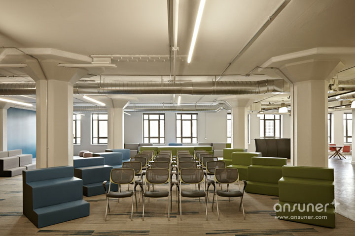 室内布局高密度的工作区与多样化的开放服务区形成对比,公共区域为合作交流、头脑风暴以及各种活动提供了充足的空间。温暖的色调、创意性的活力空间,青春的气息在室内散发。在不到一年的时间,已经有长长的一串创业公司名单等候加入到 Runway孵化社区。