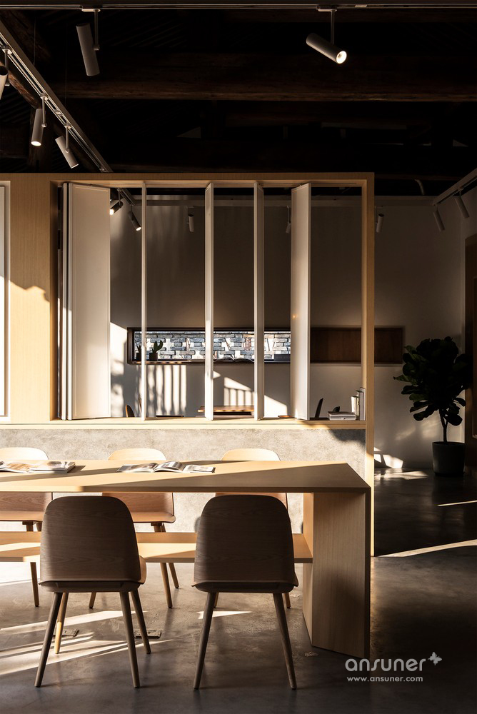 在灰色水磨石的连接下,沿河的立面用节奏较为舒缓的矩形体块排布开来。其中主入口连接了室内吧台区域,将它们组合在一个盒子当中嵌入房间,形成了简洁明确的功能划分。为书籍展示和阅读讨论设计的大工作桌放置于敞亮的玻璃窗旁,停留在此能感受饱满和谐的阳光和窗外恰到好处的小河垂柳。西侧格栅折叠窗设计巧妙地在回应传统装饰语言的同时也可用于夏日遮阳。