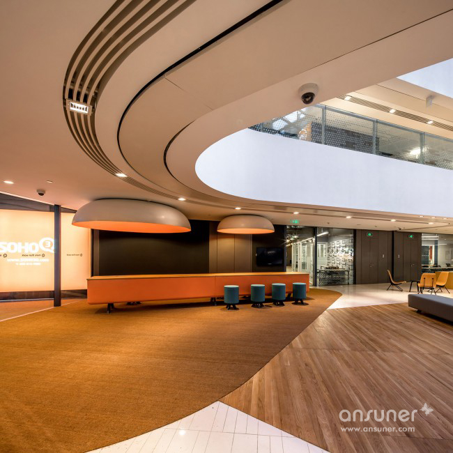 设计师决定善用购物中心的空间, 将商场过道巧妙的布局为work station lab,把原有的商铺空间改建为让租客悠闲relax的café和开放式茶水间,舒缓紧张的工作节奏。此外,如何改装两个宏大明亮的中庭,让它们作为整个3Q的核心焦点,无限发挥3Q鼓励networking的凝聚力?