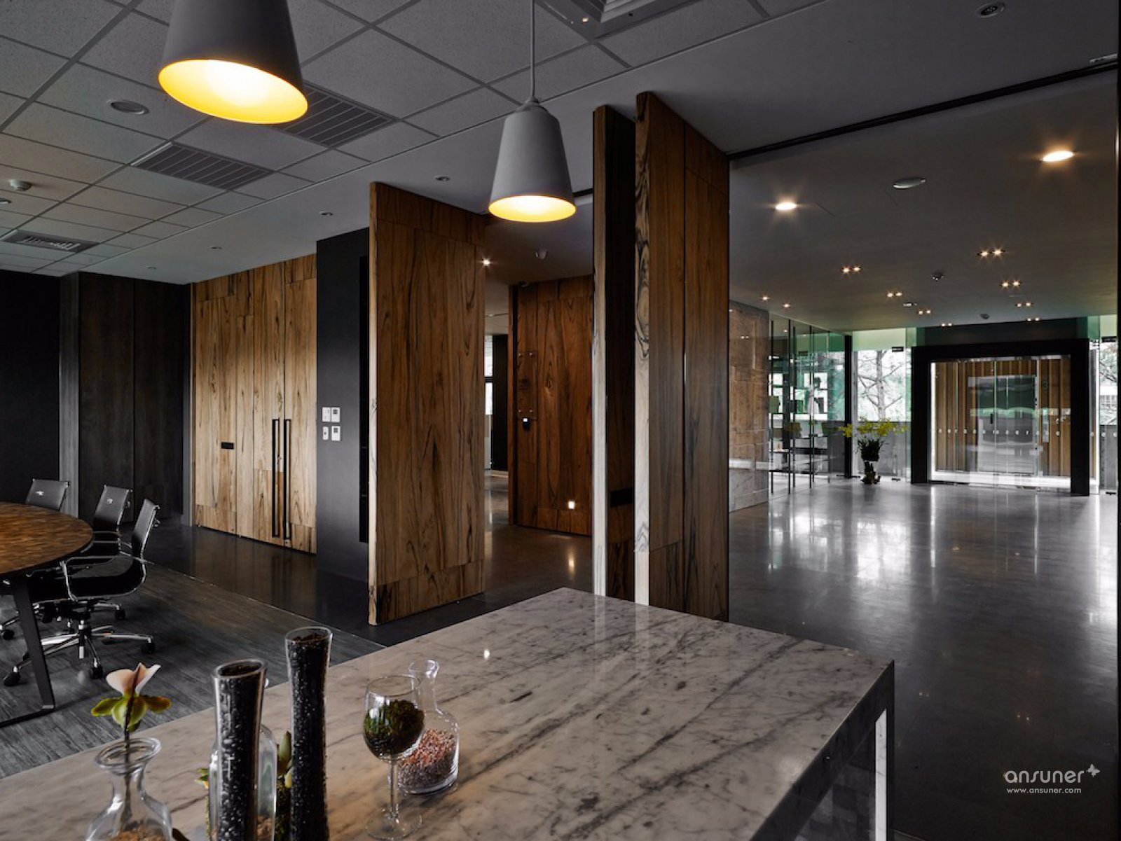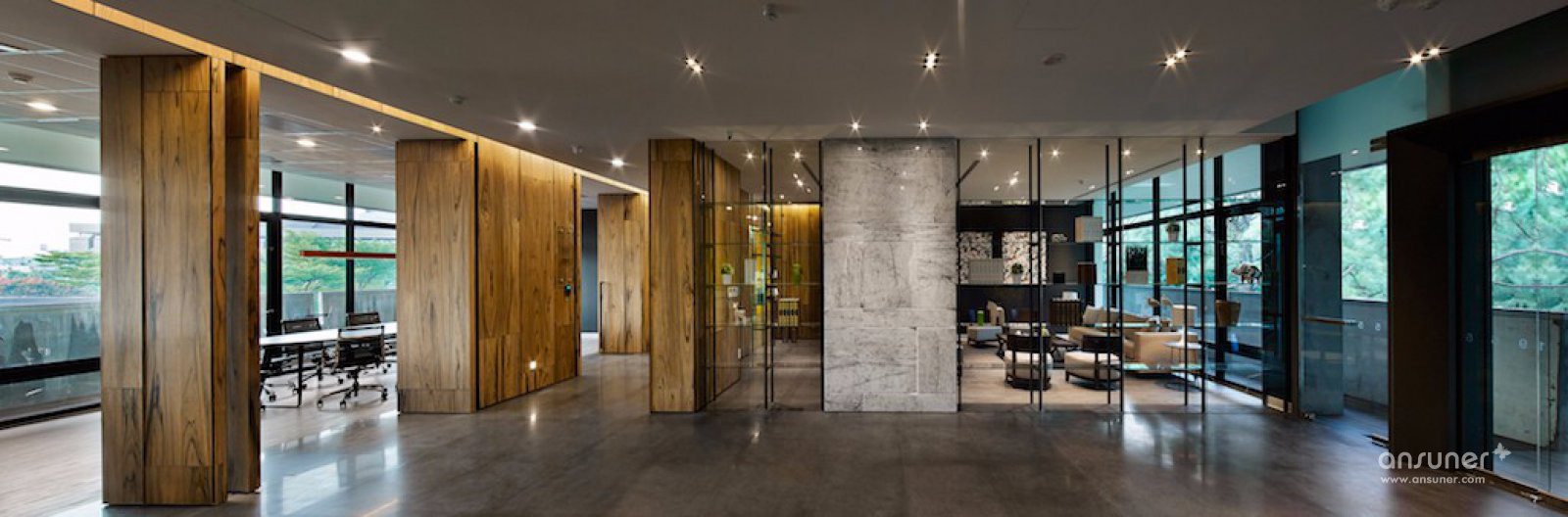 通透的梯厅,多功能的会议室,当门片全部开启时,光线自由篡流,阴霾一扫而空。