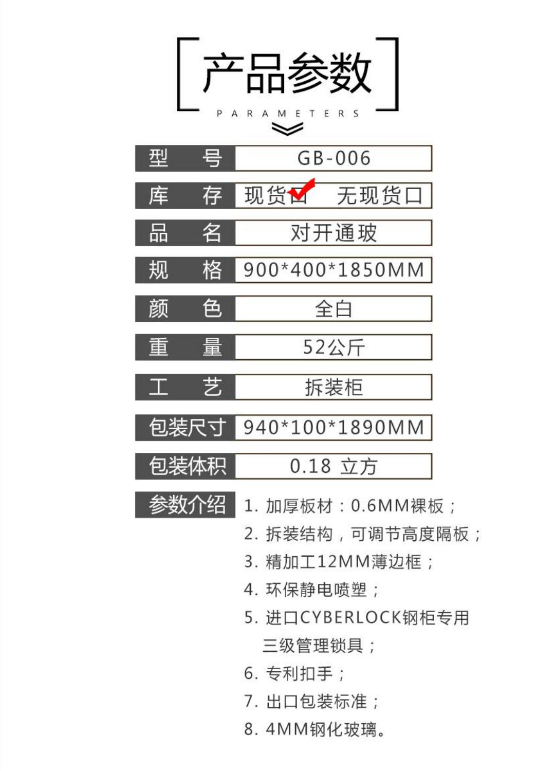 1加厚板材:0.6MM裸板 2.拆装结构,可调节高度隔板; 3精加工12MM薄边框; 4.环保静电喷塑; 5进口CYBERLOCK钢柜专用三级管理锁具; 6.专利扣手; 7.出口包装标准; 8.4MM钢化玻璃。